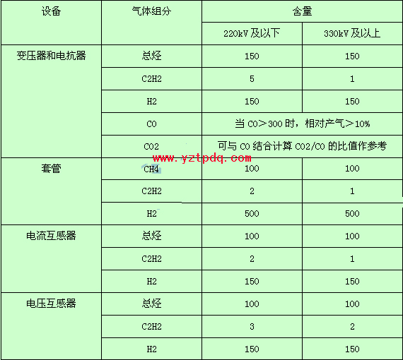 DL/T722-2000《變壓器油中溶解氣體分析和判斷導則》給出了對出廠和新投運的變壓器等設備氣體含量要求和運行中設備油中溶解氣體含量的注意值,作為診斷變壓器故障性質(zhì)的重要依據(jù),如下表2-2、表2-3: