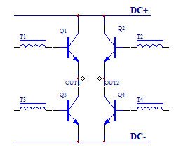 圖中,Q1~Q 4為四個等效三極管,分別對應(yīng)變電源的四個橋臂。每個橋臂由數(shù)千只三極管并聯(lián)組成,并采取了有效的均衡電流措施。正半周時,前級放大信號通過推動變壓器(T1~T4)作用于Q1~Q4三極管的基極,Q2,Q3截止;Q1,Q4導(dǎo)通,電流由Q1至負載再到Q4形成正弦波的正半周。負半周時模擬信號推動Q2,Q3的基極,Q1,Q4截止,Q2,Q3導(dǎo)通, 電流由Q3至負載再至Q2形成正弦波的負半周, 從而在負載上構(gòu)成一個完整的正弦波。