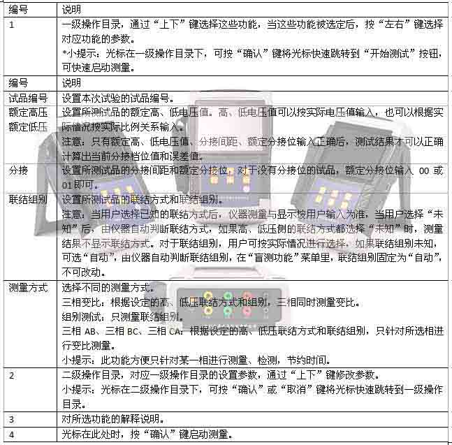 對于具有多個分接位的變壓器,輸入額定高、低壓電壓值、分接間距、額定檔位,是為了使測試結(jié)果可以自動計算出誤差值,以及分接開關(guān)所處的分接位。