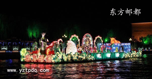 “東方郵都”號(hào)花船由高郵市承制,該花船以運(yùn)河情為主題,突出了高郵豐富的歷史與文化,顯示了一個(gè)歷史文化與現(xiàn)代文明交相輝映的千年古城。