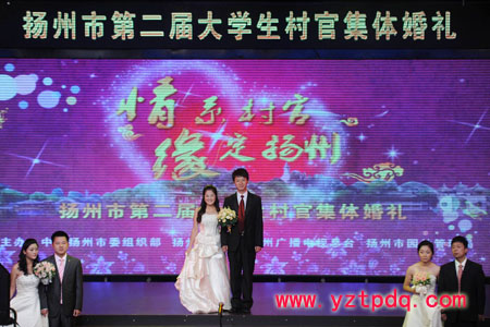 2011年10月18日,由揚州市委組織部、市婦聯(lián)、市廣電總臺、市園林管理局等單位聯(lián)合主辦的揚州市第二屆大學生村官集體婚禮在廣電中心演播廳隆重舉行,15對大學生村官“情系村官、緣定揚州”集體成親。市委常委、組織部部長丁純親臨現(xiàn)場,為大學生村官新人證婚。