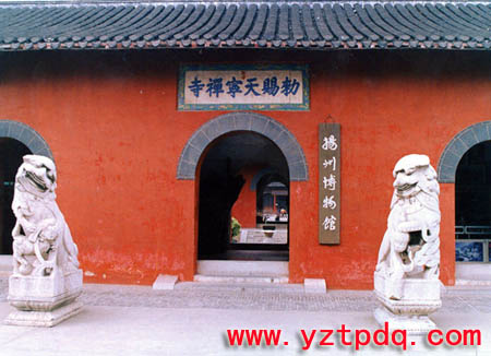 抗日戰(zhàn)爭期間,天寧寺為侵華日軍所占,淪為兵營。由于年久失修,使用不當,至70年代末,已面目全非。自1984年夏,共耗資141萬元進行大修。大修后的天寧寺占地908平方米,建筑面積5000多平方米,中軸線上有山門殿、天王殿、大雄寶殿、華嚴閣,兩側(cè)廊房92間。整個建筑布局對稱、嚴謹。山門殿單檐歇山頂,面闊3間。天王殿亦為單檐歇山頂,四面有廊,面闊5間284米。大殿重檐歇山頂,四面有廊,前后有月臺,面闊5間328米,進深15檁25米,脊檁高19米。殿后走廊東壁嵌有清同治十一年(1872年)立《重修天寧寺碑》,西壁嵌有1987年立《重修天寧寺碑記》。修復(fù)后,用作揚州博物館新址,對外開放。