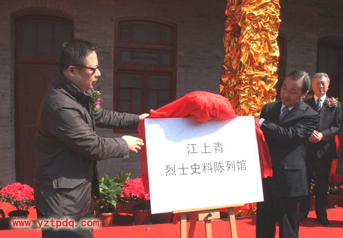 揚(yáng)州市委書記、市長謝正義,江上青烈士親屬代表彭健明為史料陳列館揭牌。省民政廳常務(wù)副廳長侯學(xué)元,以及徐益民、趙旻、張躍進(jìn)、張愛軍、袁秋年、盧桂平、陳揚(yáng)、王智永、袁啟俊、桑光裕等市四套班子領(lǐng)導(dǎo)出席開館儀式。